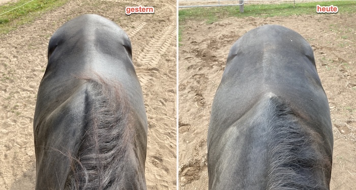 Ein Vergleichsfoto unserer Stute nach dem Wechsel von zuckerarmem zu zuckerreichem Heu. Man erkennt rechts deutlich nicht nur die umfangreichere Darmfüllung sondern auch gerade rechts und links der Wirbelsäule die massiven Wassereinlagerungen. Zwischen den Fotos liegen gerade einmal 24 Stunden.